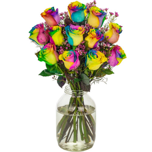 Bouquet of 12 luxurious happy rainbow roses hand wrapped with exotic foliage.