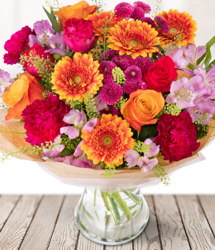 Autumn Daze is a fun and colourful bouquet with purple alstroemeria and carnations, warming orange germini, and gorgeous cerise and orange roses. Sent in our signature Eflorist box for safe transit, this bouquet is sure to enchant the recipient from the moment they open it. Enjoy our nationwide delivery and know exactly when the flowers are delivered with tracking. An instant mood booster with a surprisingly small price tag!