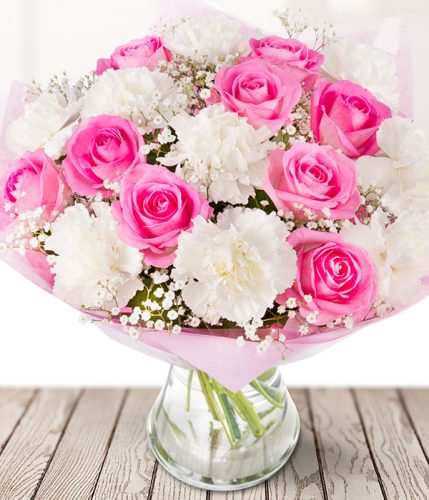 White carnations nestled in amongst pretty pink roses and gypsophila make up this delicate bouquet. Delivered in bud for longevity, these unbeatably priced blooms promise to unfold their magic gradually after reaching the lucky recipient. Sent in our signature Eflorist box for safe transit, this bouquet is sure to enchant the recipient from the moment they open it. Enjoy our nationwide delivery and know exactly when the flowers are delivered with tracking. Eflorist, where value meets beauty.