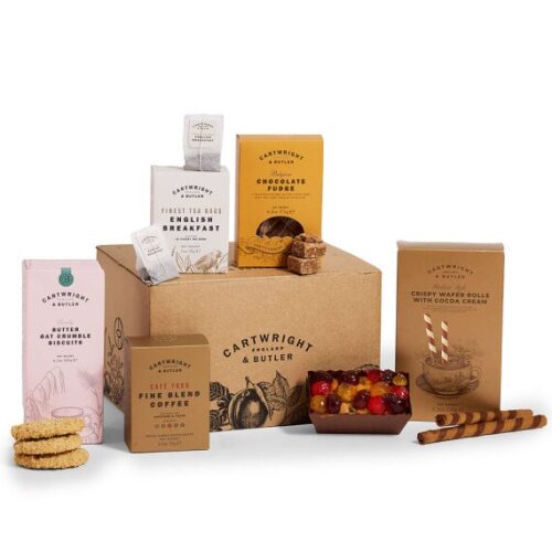 Enjoy the refined flavours of English Breakfast tea and fine blend coffee, the perfect start to your day or an afternoon break. Savour the delicate chocolate and peanut wafer crispies and indulge in the rich butter crumble biscuits. For those with a sweet tooth, this delightful gift box includes luxurious handmade cherry and chocolate flapjacks. This hamper contains 6 items: Cartwright & Butler Milk Chocolate Chunk Biscuits 200g Cartwright & Butler Cocoa and Peanut Cream Crispy Wafers 150g Cartwright & Butler English Breakfast Tea (10x3g) Cartwright & Butler Café York Fine Blend Coffee 50g Cartwright & Butler Sea Salted Fudge 175g Cartwright & Butler Mini Cherry Loaf Cake Delivered in a postal box.