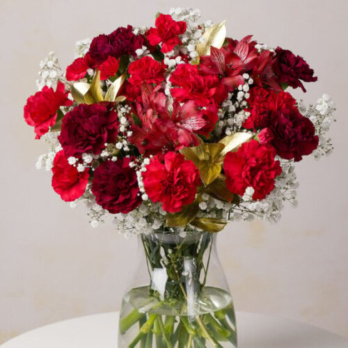 A beautiful mix of Carnations and Spray Carnations in shades of red and burgundy with red Alstroemeria. Complemented by delicate white Gypsophila and festive gold Ruscus leaves.