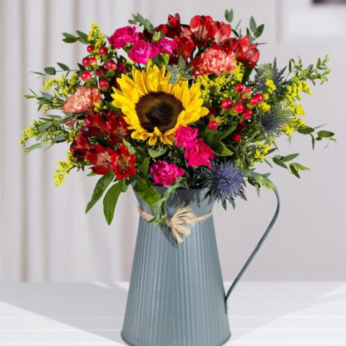 A lovely display of autumnal Carnations and Alstroemeria alongside a delightful Sunflower, red Hypericum berries and a thistle. A sunny gift for a crisp autumn day!