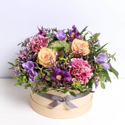 Rich in lavender, orange and pink colour tones, our Jewel Tone Hatbox is a combination of Freesias, Carnation and Roses. Beautiful and elegant, these fresh, hand tied flowers are perfect for any occassion.