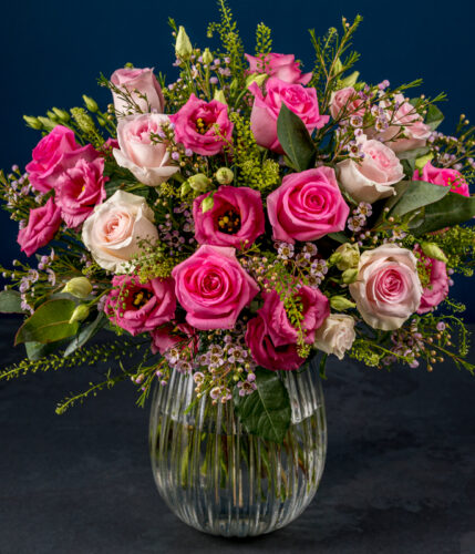The soft pink shades in this bouquet are the perfect way to send someone a little love and make them blush! Made up of pink Lisianthus, two varieties of scented pink Roses, pink wax flowers and foliage to complement.