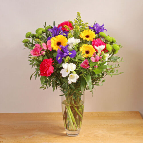 A pleasing and vibrant bouquet featuring a combination of fresh Germini, Iris and Carnation. The perfect handmade gift for any occasion. This bouquet will be lovingly created by an experienced florist, order before 2pm for same day delivery.