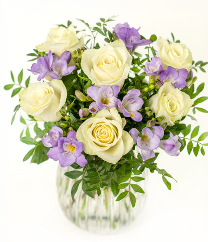 This bouquet of purple freesias, white roses, and lush foliage offers a stunning display without breaking the bank. Delivered in bud to extend their beauty, these flowers arrive in a secure, elegantly designed Eflorist box, setting the stage for a magical unboxing moment. With the simple addition of water and our nourishing flower food, the receiver will be greeted by radiant blooms within just two days. This bouquet will be delivered by courier with tracked delivery for peace of mind. Value without compromise.