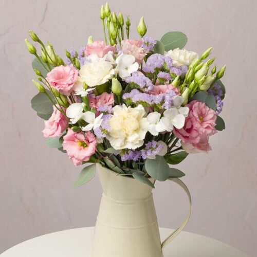 Pink Snapdragon are accompanied by cream Carnations and pure white Spray Carnations. Delicate purple Statice and fresh Eucalyptus give this bouquet a wonderful finish, making it the perfect gift to send for any occasion. Our letterbox flower gifts are delivered in specially designed letterbox friendly packaging and protected by fully compostable brown paper wrap, ensuring a wonderful and creative gift for the recipient.
