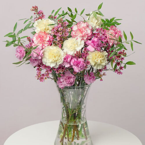 A delightful collection of Carnations and Spray Carnations in sweet shades of pink, cream and lilac. Finished with pink Wax flower and Parvi foliage, this long-lasting bouquet is sure to brighten their day.