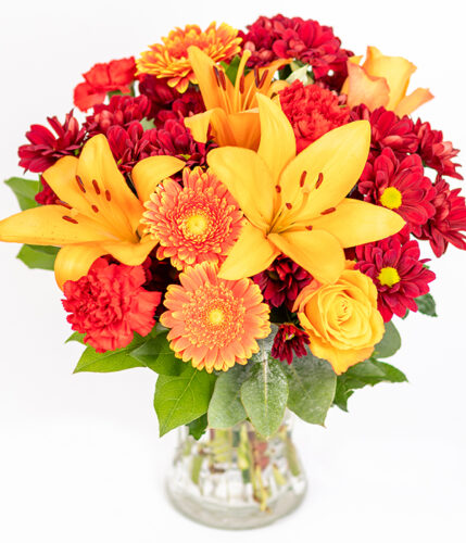 Shades of Autumn is a beautiful bouquet containing a mixture of red, orange, and green tones. Roses, lilies, germini, carnations, chrysanthemums, and seasonal foliage are carefully arranged and sent via a tracked courier service. Sent in a special Eflorist box designed to protect the stems and provide a pleasant unboxing experience. The flowers arrive in bud, and with just a splash of water and our included flower food, the blooms will gradually open up within two days, revealing their full splendour.