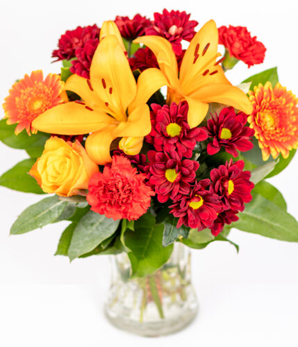 Shades of Autumn is a beautiful bouquet containing a mixture of red, orange, and green tones. Roses, lilies, germini, carnations, chrysanthemums, and seasonal foliage are carefully arranged and sent via a tracked courier service. Sent in a special Eflorist box designed to protect the stems and provide a pleasant unboxing experience. The flowers arrive in bud, and with just a splash of water and our included flower food, the blooms will gradually open up within two days, revealing their full splendour.