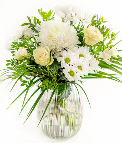 This beautiful white bouquet of chrysanthemums, roses, freesia and pistache greenery is the definition of elegance. Delivered in bud to extend their beauty, the flowers gradually open after arrival for a lasting floral experience. Carefully packed in a protective Euroflorist box, they arrive safe, fresh, and ready to delight with every unboxing. Tracked delivery allows you to follow your surprise from dispatch to doorstep. A stunning bouquet of pure grace, offering top quality at an irresistible price.