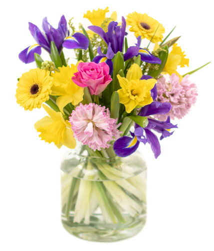 Bursting with yellow germini, pink roses and bold blue iris, this bouquet is perfect for sending a little sunshine to someone’s door. Sent via a tracked courier service in a secure Eflorist box.