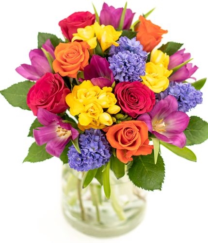 The epitome of spring. Hot pinks mingled with yellow freesia, fragrant blue hyacinth, tulips, and orange roses, creating a stunning, yet inexpensive arrangement that’s sure to impress. Witness the miracle of nature unfolding in your vase as these flowers arrive in bud, ready to enchant the recipient by opening up within 2 days after delivery. Delivered in a special Eflorist box, this bouquet promises a delightful unboxing experience for your loved one.