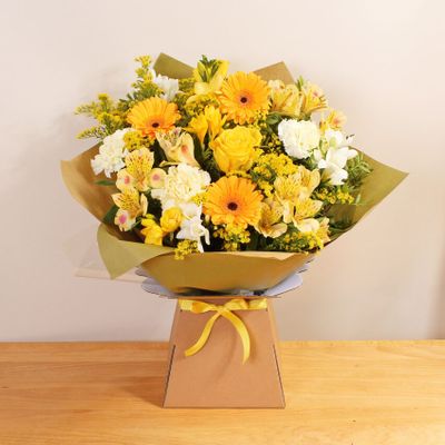 Our dazzling Sunshine Giftbox is certain to brighten even the darkest day, with bright pops of yellow and orange. This bouquet will be handcrafted by an experienced florist, order for same day delivery by hand.