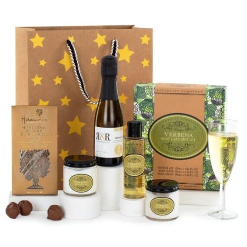 A perfect gift for someone who deserves to put their feet up and enjoy a bit of pampering, whilst enjoying a glass of prosecco and chocolate treats! This hamper contains 3 items: Prosecco R&R Robert & Reeves Italy 20cl 10.5% vol Naturally European Verbena Body Care Gift Set Holdsworth Exquisite Handmade Chocolates Sensational Sea Salt Caramel Truffles 100g Delivered in a gift bag.