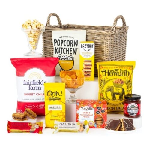 Delight your loved ones with The Proudly Vegan Hamper, beautifully presented in a reusable willow gift basket. This thoughtful selection is perfect for anyone embracing a vegan lifestyle. This hamper contains 9 items: Angelic Chilli & Caramelised Onion Savoury Biscuits 142g Arran Fine Foods Tomato & Red Pepper Chutney 185g Fairfields Farm Sweet Chilli Crisps 150g Howdah Onion Bhaji Crunchy Crescents 150g Lazy Day Millionaire’s Shortbread 150g Oatopia Almond Bakewell Oat Bake 60g Oatopia Peanut Butter Oat Bake 60g Ooh! Chocolata Dairy Free & Vegan Honeycomb Milk Chocolate 100g Popcorn Kitchen Simply Sweet 30g Packed in a Willow Basket.