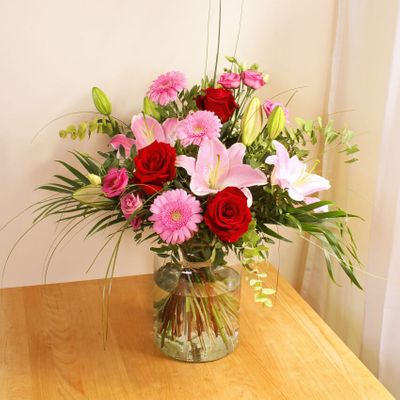 The ideal handcrafted bouquet to express your love, this colourful combination of Germini, Lily, Lisianthus and Roses are fantastic Valentine’s flowers. Show your feelings with our hand tied flowers. This bouquet will be handcrafted by an experienced florist, order for same day delivery by hand, or next day delivery via our courier.